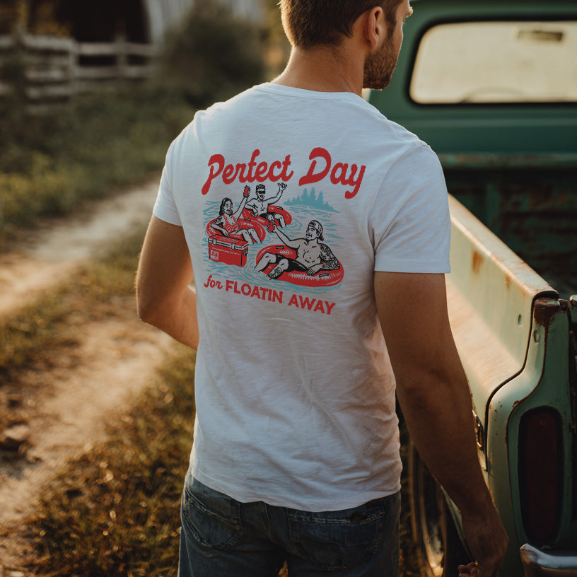 If heaven’s got a lazy river, it probably looks somethin’ like this. The Floatin’ Away tee is your ticket to clockin’ out, crackin’ open a cold one, and lettin’ the current do the work.